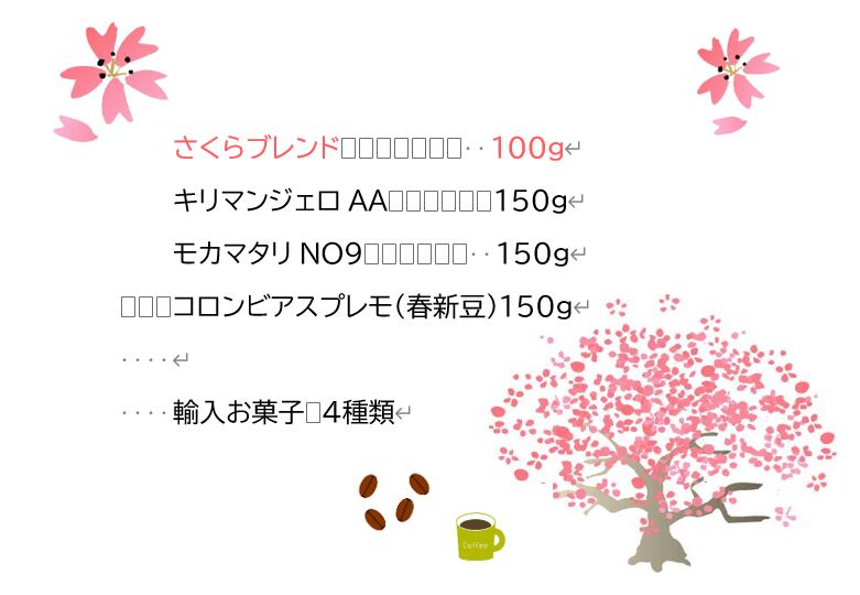 さくらブレンドは、心地よい春の風を感じさせるやわらかな味わいが特徴です。桜の香りがふんわりと広がり、あなたの日常に特別な瞬間をもたらします。もうひとつのキリマンジェロは、新しい季節を予感させる香ばしさが魅力です。どちらのコーヒーも、心を穏やかにし、春の温もりを一杯の中で楽しんでいただけることでしょう。